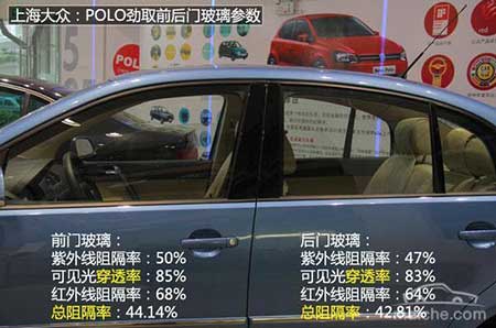 經(jīng)過測試,POLO勁取的前門玻璃參數(shù)為:紫外線阻隔率50%、可見光穿透率85%、紅外線阻隔率68%,總阻隔率44.14%。后門玻璃的參數(shù)為:紫外線阻隔率47%、可見光穿透率83%、紅外線阻隔率64%,總阻隔率42.81%。